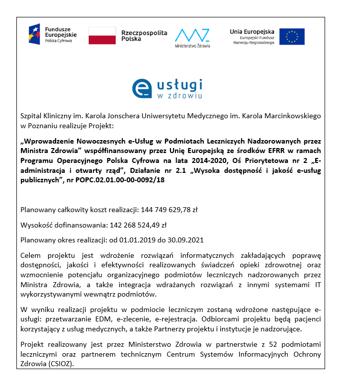1. E-szpital rozwój systemu informatycznego, wdrażanie elektronicznej dokumentacji medycznej i e-usług w Szpitalu Klinicznym im. K. Jonschera w Poznaniu. 2. Rozwój e-usług Szpitala Klinicznego im. K. Jonschera UM w Poznaniu w oparciu o dostęp do Elektronicznej Dokumentacji Medycznej dla pacjentów oraz jednostek świadczących usługi medyczne. 3. Poprawa diagnostyki i jakości leczenia dzieci z chorobami dróg oddechowych w Szpitalu Klinicznym im. K. Jonschera UM w Poznaniu. 4. Wielkopolska Onkologia Dziecięca- Wielkopolski Program Profilaktyczny w zakresie onkologii dziecięcej. 5. Wprowadzenie nowoczesnych e-Usług w podmiotach leczniczych nadzorowanych przez Ministra Zdrowia.